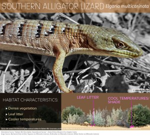 The Southern Alligator Lizard is one of the most widespread urban dwelling lizard based on observations reported by citizens in the Los Angeles basin. In the Baldwin Hills it was spotted in most places, usually in cooler, densely vegetated areas. Unlike the other lizards in the Baldwin Hills, the Southern Alligator lizard usually won’t be found basking in the sun, making it more of a challenge to spot. Though the reptile surveys have not observed this lizard as frequently as the Western Fence or Side-blotched, the more secretive Southern Alligator lizard is likely more common than is documented.