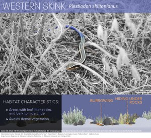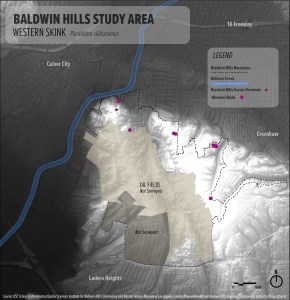 The Western Skink, an exciting discovery for the Baldwin Hills, is typically not found in California valleys such as the San Fernando Valley or LA basin. Populations do exist however in hilly areas such as the Palos Verdes Peninsula. This small, secretive lizard was recorded 11 times in the Baldwin Hills survey in 2014-2015 in Kenneth Hahn State Recreation Area and around the Scenic Overlook. Since there have been no documentations of the Western Skink in the Ballona region or in the surrounding urban area, it appears this population is genetically isolated from others in the region.